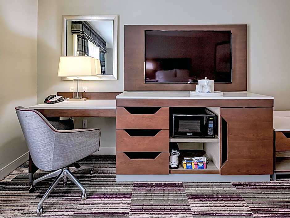 This hearing accessible, non-smoking room features two queen-sized beds. The room also has a visual alarm and notification devices for the doorbell or door knock and incoming phone calls. The room features our clean and fresh Hampton bed, a HDTV, and easy to operate alarm clock/radio. In the bath you will enjoy a WaterPik showerhead and curved shower rod. The free WiFi will help you stay connected while on the road. If you prefer not to work at the desk, you can use the convenient lapdesk instead. You'll also enjoy the convenience of having a coffeemaker with tea service and iron/ironing board in your room. Any corresponding photo may not reflect the specific accessible room type or room feature.